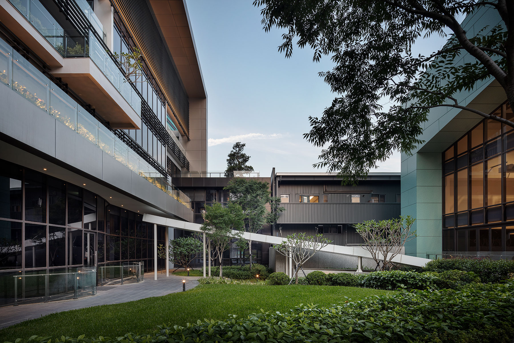 以融合創新景觀設計,結合自然與建築空間,強調永續性與生態平衡。植栽選擇富含象徵意義,並優化員工工作與休憩空間,創造充滿活力且環保的企業環境。
