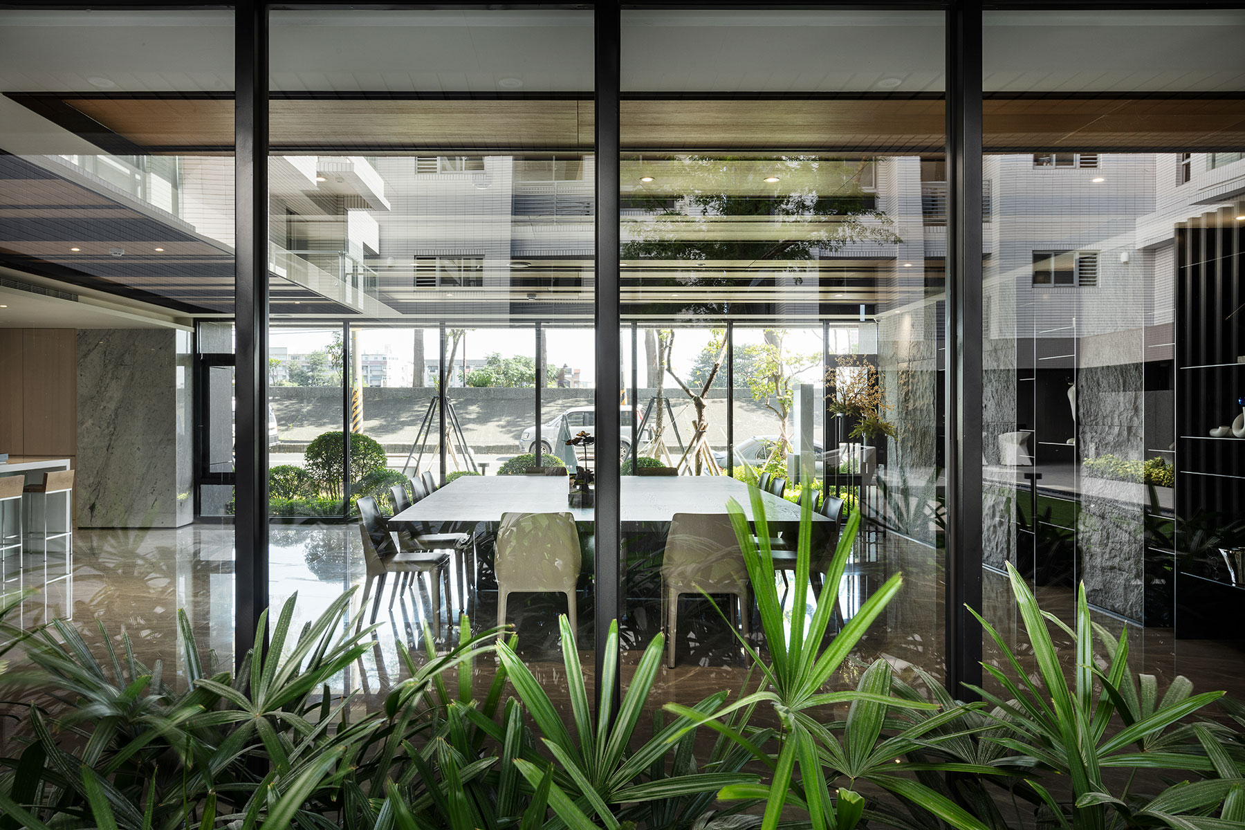 本案整體設計配合建築量體合院型態,以減法美學的簡約靜謐的空間意象為初衷,延續留白、層疊與借景的手法,運用以簡約線條勾勒出的幾何塊狀的鑲嵌與錯落作為活動場域的劃分。